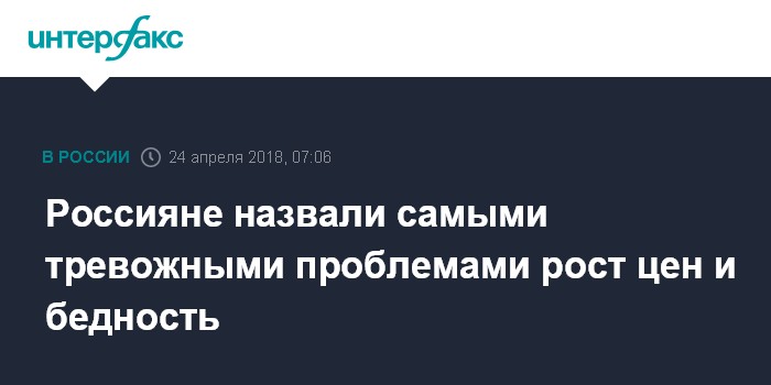 Москва. 24 апреля. INTERFAX.RU - Более 60% россиян наиболее тревожной проблемой считают рост цен, более трети россиян тревожат кризисные проблемы в экономике страны и четверть опрошенных - недоступность многих видов медицинского обслуживания, свидетельствуют данные социологического исследования "Левада-Центра".