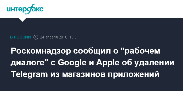 Москва. 24 апреля. INTERFAX.RU - Роскомнадзор ведет рабочий диалог с Google и Apple, в том числе по ситуации с Telegram, и настаивает на прекращении доступа российских пользователей к приложению мессенджера в онлайн-магазинах этих компаний, сообщили "Интерфаксу" в пресс-службе ведомства.