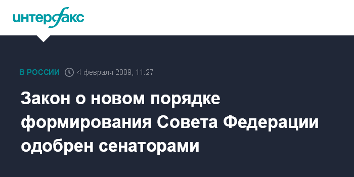 Москва. 4 февраля. INTERFAX.RU - Совет Федерации одобрил закон о новом порядке формирования верхней палаты, принятый Госдумой 28 января.