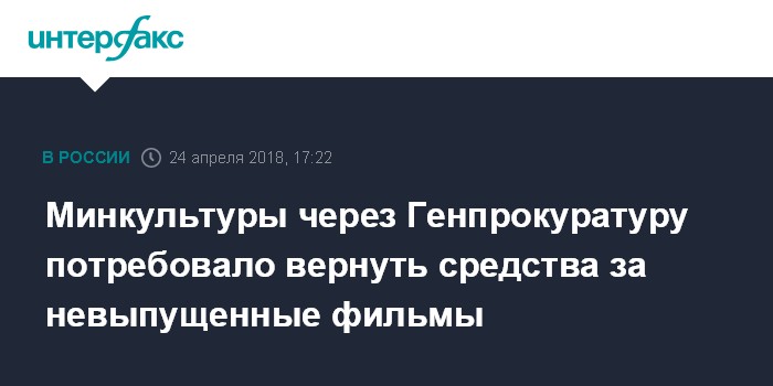 Москва. 24 апреля. INTERFAX.RU - Минкультуры обратилось в Генпрокуратуру по делу о возврате бюджетных средств, полученных компаниями на производство фильмов, которые так и не вышли. Соответствующее обращение подписано министром культуры 18 апреля 2018 года.