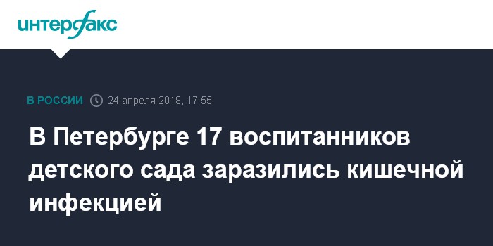 Москва. 24 апреля. INTERFAX.RU - Воспитанники и персонал детского сада в поселке Шушары на юге Петербурга заразились кишечной инфекцией.