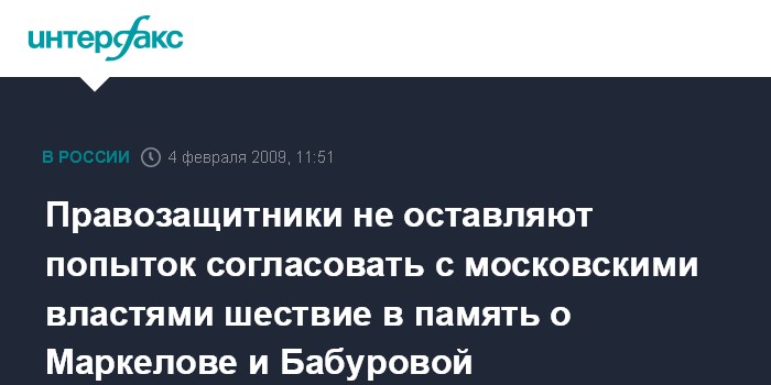 Москва. 4 февраля. INTERFAX.RU - Российские правозащитники решили предпринять еще одну попытку согласовать с московскими властями шествие в столице в память об убитых адвокате Станиславе Маркелове и журналистке Анастасии Бабуровой.