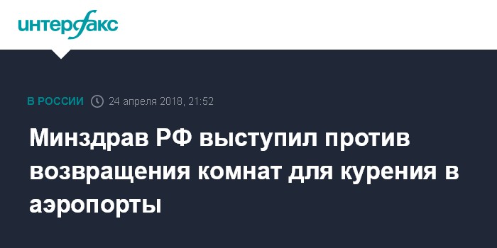 Москва. 24 апреля. INTERFAX.RU - Минздрав России выступает против разрешения организации специально оборудованных мест для курения в аэропортах, так как это негативно скажется на здоровье некурящих граждан и нарушит их конституционные права.