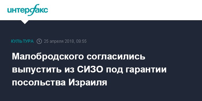 Москва. 25 апреля. INTERFAX.RU - Следствие частично удовлетворило ходатайство защиты согласилось выпустить из СИЗО бывшего директора "Гоголь-центра" Алексея Малобродского, обвиняемого по делу о хищениях в "Седьмой студии", в связи с решением ЕСПЧ и гарантиями посольства Израиля. Об этом сообщила "Интерфаксу" в среду его адвокат Ксения Карпинская.