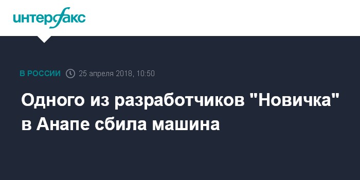 Москва. 25 апреля. INTERFAX.RU - Один из разработчиков отравляющего вещества "Новичок" Владимир Углев, давший несколько интервью в связи с отравлением в Солсбери экс-сотрудника ГРУ Сергея Скрипаля и его дочери Юлии, попал под машину в Анапе, его жизни ничего не угрожает, сообщил "Интерфаксу" информированный источник.