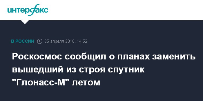 Москва. 25 апреля. INTERFAX.RU - В Роскосмосе подтвердили планы заменить летом вышедший из строя космический аппарат "Глонасс-М".