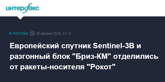 Москва. 25 апреля. INTERFAX.RU - Ракета-носитель "Рокот", стартовавшая в среду с космодрома Плесецк, успешно вывела на низкую околоземную орбиту головную часть в составе разгонного блока "Бриз-КМ" и европейского спутника дистанционного зондирования Земли Sentinel-3B.