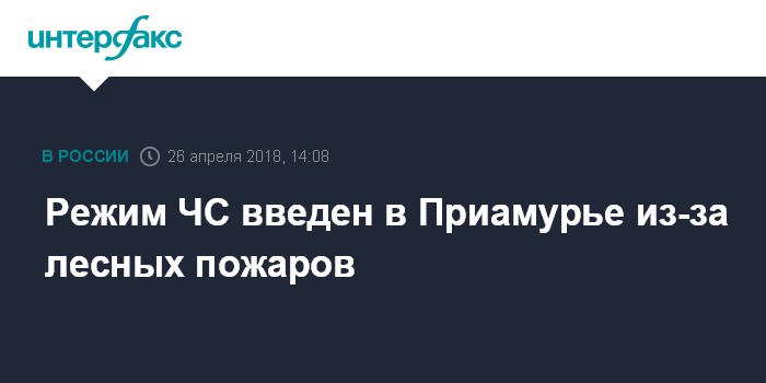 Москва. 26 апреля. INTERFAX.RU - Режим чрезвычайной ситуации установлен в четверг на территории всей Амурской области из-за лесных пожаров, сообщает пресс-служба регионального правительства. Решение принято на заседании комиссии по чрезвычайным ситуациям (КЧС).