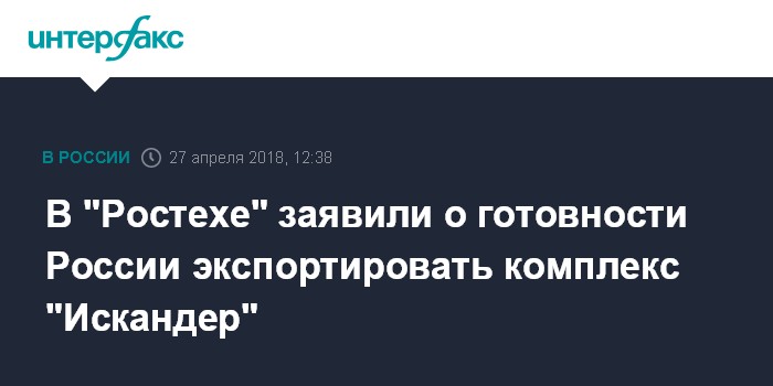 Москва. 27 апреля. INTERFAX.RU - Россия готова предложить экспортный вариант оперативно-тактического ракетного комплекса "Искандер-М" широкому кругу стран, сообщил "Интерфаксу" в пятницу директор по международному сотрудничеству и региональной политике госкорпорации "Ростех" Виктор Кладов.