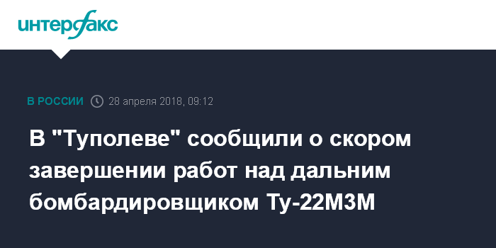 Ранее генеральный директор ПАО "Туполев" (входит в "Объединенную авиастроительную корпорацию", ОАК) Конюхов сообщил "Интерфаксу", что первый модернизированный дальний сверхзвуковой ракетоносец-бомбардировщик Ту-22М3М будет представлен в 2018 году.