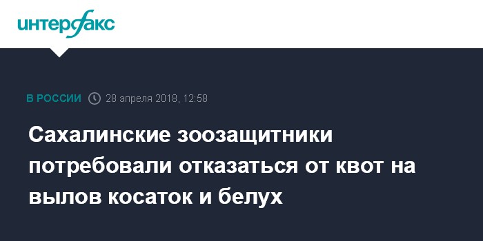 Москва. 28 апреля. INTERFAX.RU - Пикет против выделения квот на отлов в Охотском море косаток и белух проведет в Южно-Сахалинске инициативная группа "Друзья океана", действующая на базе местного туристического клуба "Бумеранг".