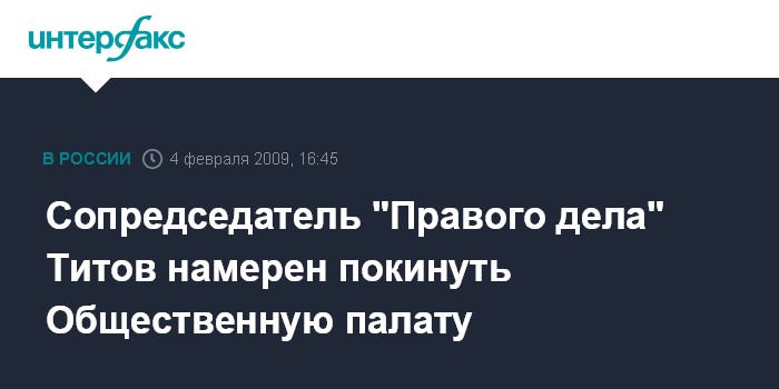 Москва. 4 февраля. INTERFAX.RU - Один из трех сопредседателей "Правого дела" Борис Титов после официальной регистрации партии покинет Общественную палату РФ, членом которой он является.