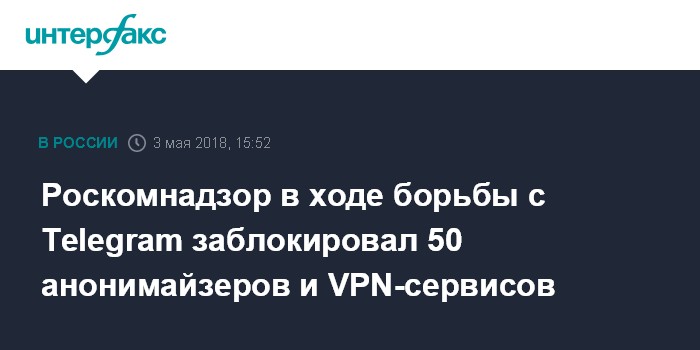 Москва. 3 мая. INTERFAX.RU - Роскомнадзор заблокировал 50 анонимайзеров и VPN-сервисов, обеспечивавших доступ к Telegram, рассказал журналистам замглавы Роскомнадзора Вадим Субботин.