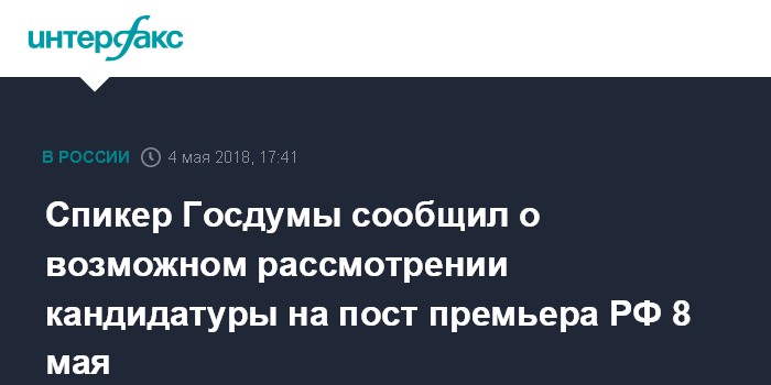 Москва. 4 мая. INTERFAX.RU - Председатель Госдумы Вячеслав Володин сообщил, что в случае внесения президентом РФ кандидатуры на пост председателя правительства 7 мая Госдума рассмотрит этот кадровый вопрос на ближайшем заседании (оно намечено на 8 мая).