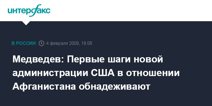 Москва. 4 февраля. INTERFAX.RU - Президент РФ Дмитрий Медведев видит обнадеживающие признаки в первых действиях администрации США применительно к Афганистану.