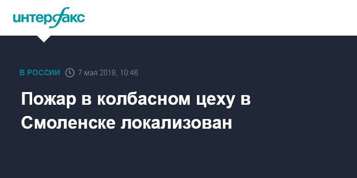 Москва. 7 мая. INTERFAX.RU - Возгорание в колбасном цеху в Смоленске удалось локализовать, сообщили "Интерфаксу" в пресс-службе главного управления МЧС по региону.