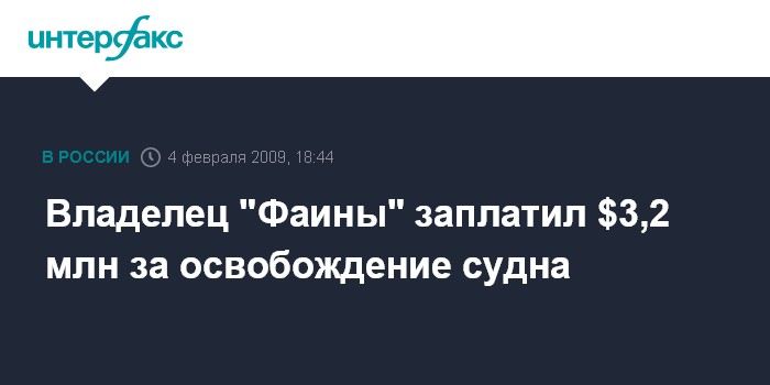 Тегеран. 4 февраля. INTERFAX.RU - Израильский владелец судна "Фаина", захваченного сомалийскими пиратами, заплатил 3,2 млн. долларов за освобождение судна, сообщил в среду иранский англоязычный телеканал "Пресс-ТВ".