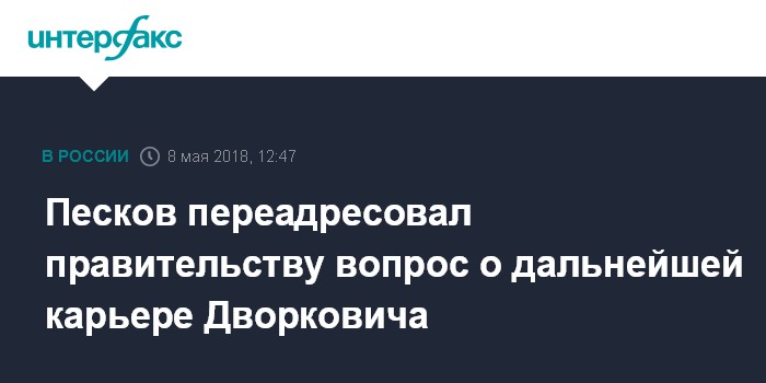 Москва. 8 мая. INTERFAX.RU - Пресс-секретарь главы государства Дмитрий Песков переадресовал правительству вопрос о дальнейшей судьбе исполняющего обязанности вице-премьера Аркадия Дворковича, чье имя не было названо накануне исполняющим обязанности премьера Дмитрием Медведевым в качестве кандидата в новый состав кабинета министров.