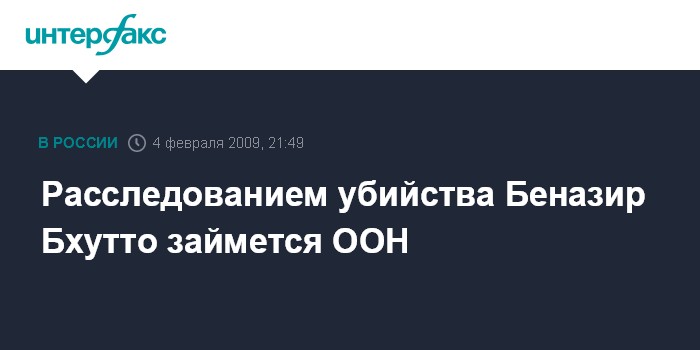 Нью-Йорк (ООН). 4 февраля. INTERFAX.RU - Комиссия по расследованию убийства лидера пакистанской оппозиции и бывшего премьер-министра страны Беназир Бхутто вскоре может быть учреждена под эгидой ООН. С таким заявлением выступил в среду генеральный секретарь ООН Пан Ги Мун по прибытии в Исламабад.