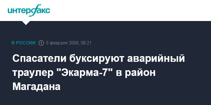 Южно-Сахалинск. 5 февраля. ИНТЕРФАКС - ДАЛЬНИЙ ВОСТОК - Спасательное судно "Справедливый" в настоящее время буксирует аварийный сахалинский траулер "Экарма-7" в район бухты Нагаева (Магаданская область), сообщили агентству "Интерфакс - Дальний Восток" в службе наблюдения за флотом Невельского морского порта.