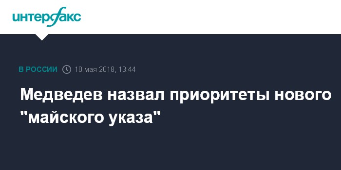 Москва. 10 мая. INTERFAX.RU - Дальнейшее повышение уровня жизни россиян и рост продолжительности жизни граждан РФ - это главные приоритеты нового "майского указа" президента РФ, заявил премьер-министр России Дмитрий Медведев.