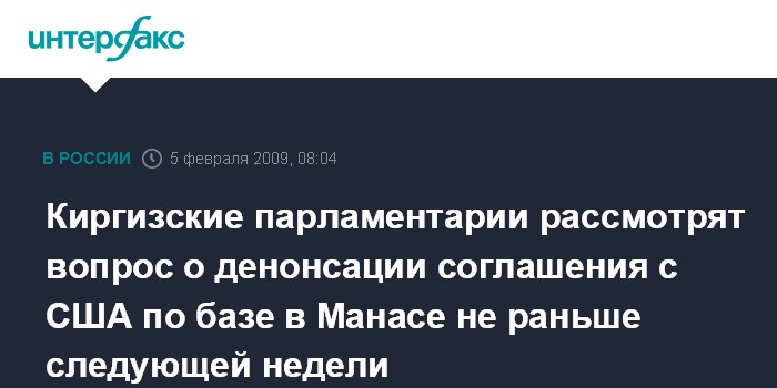 Бишкек. 5 февраля. INTERFAX.RU - Парламент Киргизии рассмотрит вопросы о денонсации соглашения с США о размещении коалиционной авиабазы "Манас" не раньше следующей недели
