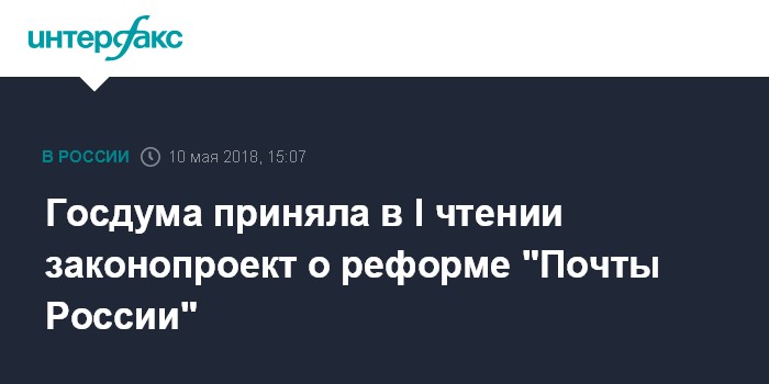 Москва. 10 мая. INTERFAX.RU - Госдума РФ на заседании в четверг приняла в первом чтении депутатский законопроект о реформе ФГУП "Почта России", который преобразует его в непубличное АО.