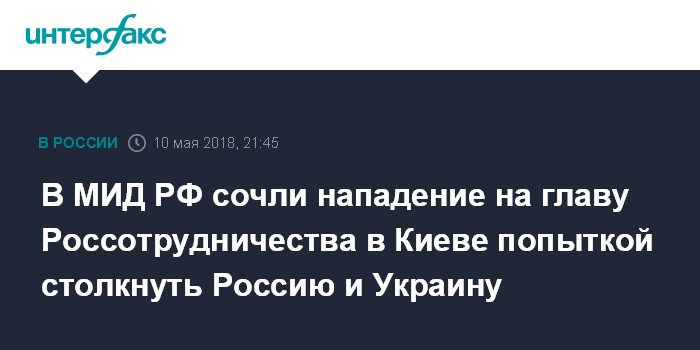 Москва. 10 мая. INTERFAX.RU - Нападение на руководителя Россотрудничества в Киеве является очередной попыткой столкнуть Россию и Украину, заявила официальный представитель МИД РФ Мария Захарова.