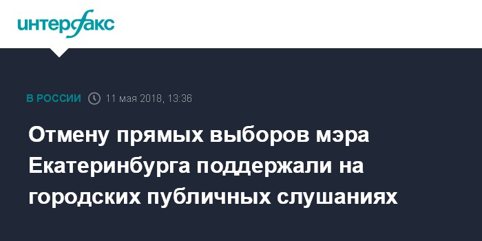 Москва. 11 мая. INTERFAX.RU - За отмену прямых выборов мэра Екатеринбурга на состоявшихся в пятницу публичных слушаниях по изменениям в городской Устав высказалось большинство их участников из числа местных жителей, сообщается на официальном сайте администрации города.