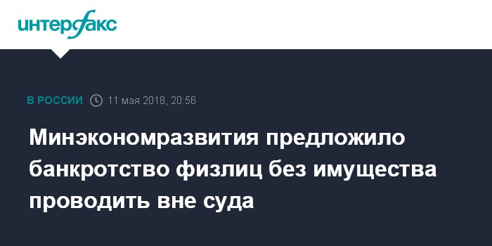Москва. 11 мая. INTERFAX.RU - Минэкономразвития РФ предлагает процедуру банкротства физических лиц, не имеющих имущества для выплат по долгам, проводить во внесудебном порядке. Об этом сообщила директор департамента финансово-банковской деятельности и инвестиционного развития ведомства Екатерина Салугина-Сороковая на круглом столе в Госдуме, посвященном развитию потребительского банкротства.
