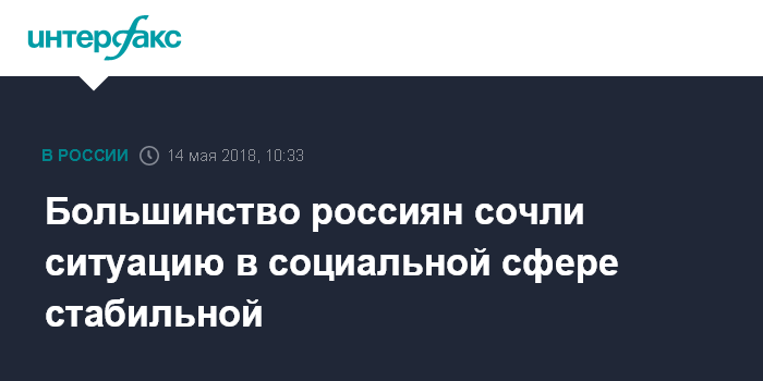 Москва. 14 мая. INTERFAX.RU - Более двух третей россиян склонны оценивать ситуацию в социальной сфере в стране как стабильную, тогда как каждый четвертый респондент дает негативные оценки, при этом 45% опрошенных полагают, что ухудшение социальной обстановки еще впереди, сообщили во ВЦИОМ по результатам социологических исследований.