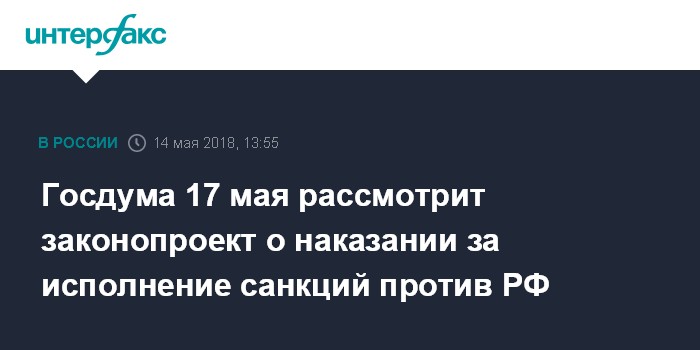Москва. 14 мая. INTERFAX.RU - Депутаты Госдумы могут на пленарном заседании 17 мая рассмотреть законопроект об уголовной ответственности за исполнение антироссийских санкций и содействие граждан РФ их введению, сообщили "Интерфаксу" в понедельник в профильном комитете.