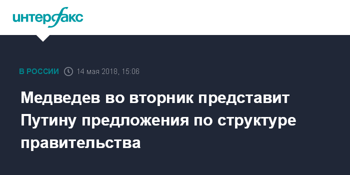 Москва. 14 мая. INTERFAX.RU - Премьер РФ Дмитрий Медведев во вторник представит президенту России Владимиру Путину предложения по структуре нового правительства, однако конкретные кадровые назначения озвучены не будут, сообщила пресс-секретарь главы правительства Наталья Тимакова.