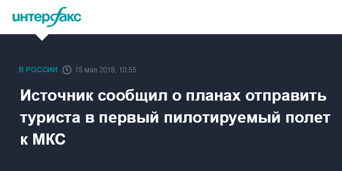 Москва. 15 мая. INTERFAX.RU - Космический турист может стать участником первого пилотируемого полета к Международной космической станции (МКС) на новой российской ракете в 2019 году, сообщил "Интерфаксу" источник в ракетно-космической отрасли.