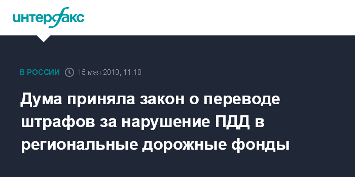Москва. 15 мая. INTERFAX.RU - Госдума на заседании во вторник приняла в третьем, окончательном, чтении правительственный законопроект, который предлагает перечислять доходы от штрафов за нарушение правил дорожного движения (ПДД) в региональные дорожные фонды.