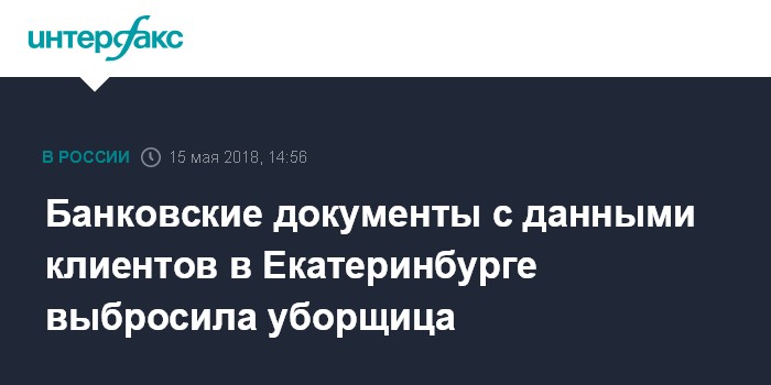 Москва. 15 мая. INTERFAX.RU - Банковские документы с персональными данными клиентов, которые нашли в мусорном баке в одном из дворов Екатеринбурга, оказались там по вине уборщицы, сообщили агентству "Интерфакс" в пресс-службе ОТБ Банка.