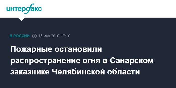 Москва. 15 мая. INTERFAX.RU - Распространение крупного лесного пожара на территории Пластовского района в Челябинской области, от которого пострадал Санарский заказник, удалось остановить к вечеру вторника, сообщил агентству "Интерфакс" министр общественной безопасности области Евгений Савченко.