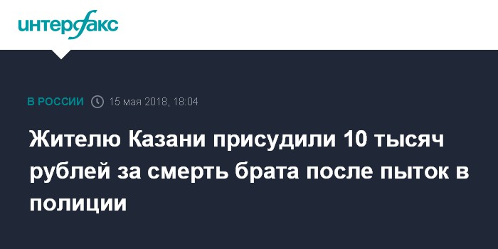 Москва. 15 мая. INTERFAX.RU - Кировский районный суд Казани взыскал 10 тысяч рублей с МВД России в пользу казанца Сергея Дроздова, чей брат Павел умер после пыток в отделе полиции "Юдино".