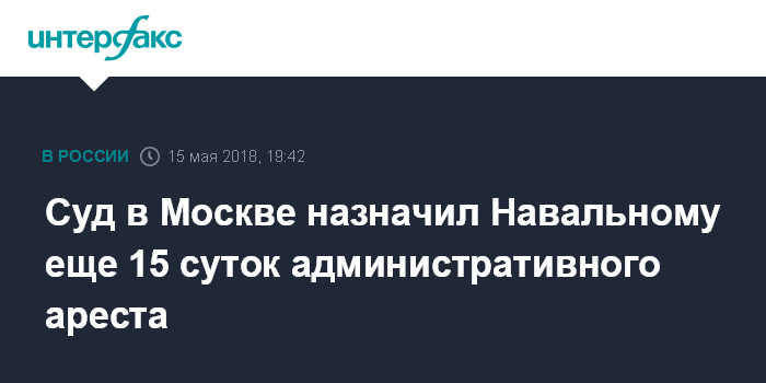 Москва. 15 мая. INTERFAX.RU - Тверской суд Москвы во вторник назначил 15 суток административного ареста оппозиционеру Алексею Навальному в качестве наказания за неповиновение полиции на протестной акции в центре города 5 мая, передает корреспондент "Интерфакса".