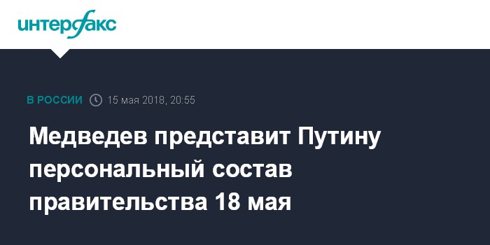 Москва. 15 мая. INTERFAX.RU - Представление главой кабмина РФ Дмитрием Медведевым президенту Владимиру Путину кандидатур на должности членов правительства состоится до переговоров главы государства с канцлером Германии Ангелой Меркель в пятницу 18 мая, сообщил журналистам пресс-секретарь главы государства Дмитрий Песков.