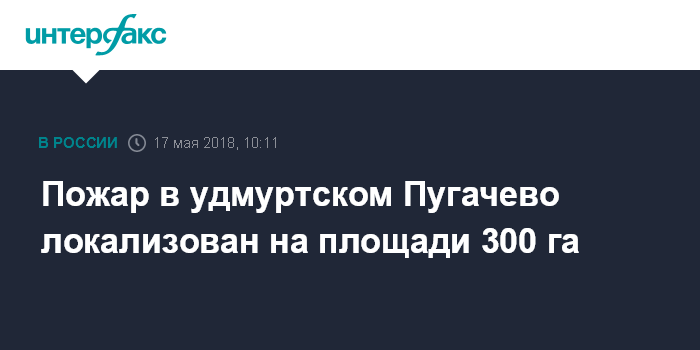 Москва. 17 мая. INTERFAX.RU - Площадь локализованного пожара на территории бывшей воинской части в селе Пугачево (Удмуртия) составила три сотни гектаров.