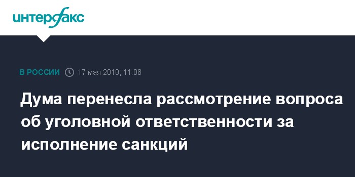 Москва. 17 мая. INTERFAX.RU - Госдума РФ в четверг проголосовала за перенос рассмотрения вопроса о введении уголовной ответственности за исполнение санкций иностранных государств на территории РФ, а также за содействие введению антироссийских санкций.