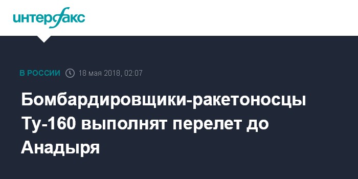 Москва. 18 мая. INTERFAX.RU - Стратегические бомбардировщики-ракетоносцы Ту-160 в нынешнем году выполнят перелет до Анадыря, сообщил командующий Дальней авиацией РФ генерал-лейтенант Сергей Кобылаш.