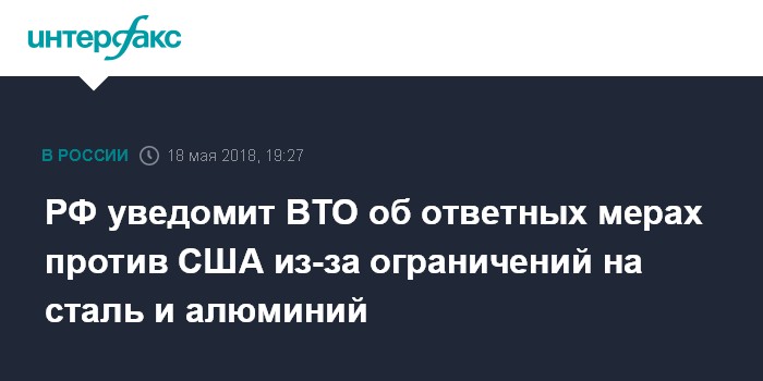 Как сообщалось, 19 апреля 2018 года Россия направила США в рамках ВТО запрос на проведение консультаций по согласованию мер, компенсирующих потери российских экспортеров, связанных с повышением США ввозных пошлин на сталь и алюминий сверх уровня американских тарифных обязательств. На проведение консультации по правилам дается месяц.