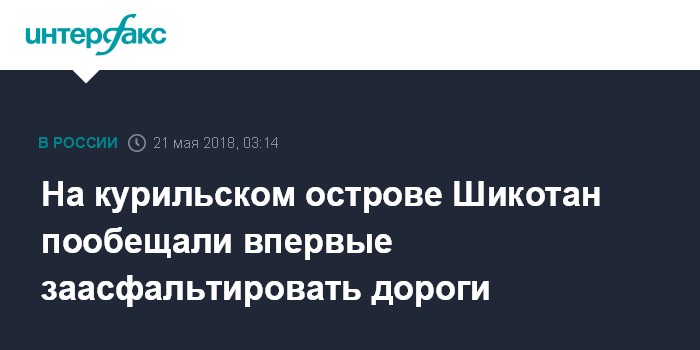 Москва. 21 мая. INTERFAX.RU - Дороги между двумя селами острова Шикотан (входит в состав Южно-Курильского района, районный центр которого - город Южно-Курильск - находится на соседнем о. Кунашир - ИФ) впервые за всю историю острова заасфальтируют, асфальт также появится в селах, сообщает пресс-служба правительства Сахалинской области.