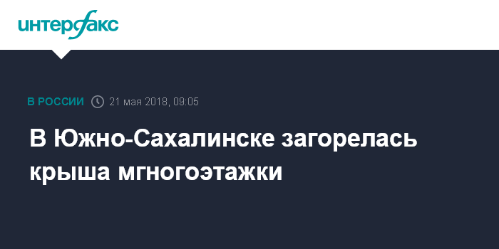 Москва. 21 мая. INTERFAX.RU - Пожар в десятиэтажном жилом доме произошел в центре Южно-Сахалинска в понедельник. Как сообщили "Интерфаксу" в ГУ МЧС по Сахалинской области, горит квартира на десятом этаже здания, огонь перекинулся на крышу дома.