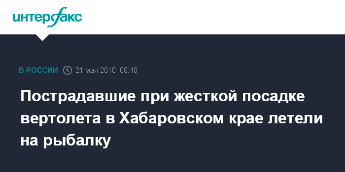 Москва. 21 мая. INTERFAX.RU - Летчик и пассажиры частного вертолета, который совершил жесткую посадку в Хабаровском крае, летели на рыбалку, сообщил агентству "Интерфакс" совладелец компании "Сонико-Чумикан" (Хабаровск) Виктор Медведев.