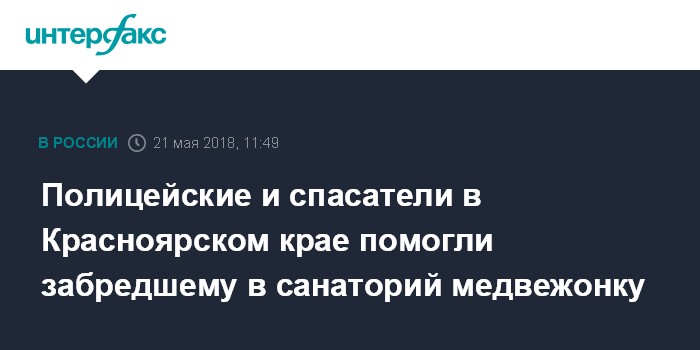 Москва. 21 мая. INTERFAX.RU - Медвежонок забрел на территорию санатория в окрестностях города Канска в Красноярском крае, сообщает пресс-служба главного управления МВД по Красноярскому краю в понедельник.