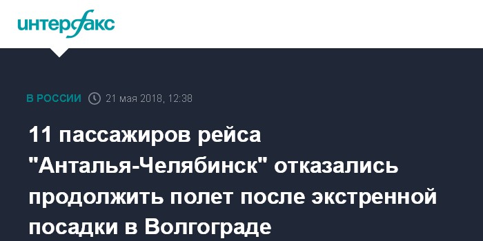 Москва. 21 мая. INTERFAX.RU - Более десяти пассажиров летевшего из Антальи в Челябинск самолета, который экстренно сел в Волгограде из-за разгерметизации салона, отказались продолжить полет на резервном борту, сообщила "Интерфаксу" в понедельник пресс-секретарь волгоградского аэропорта Диана Бакулина.