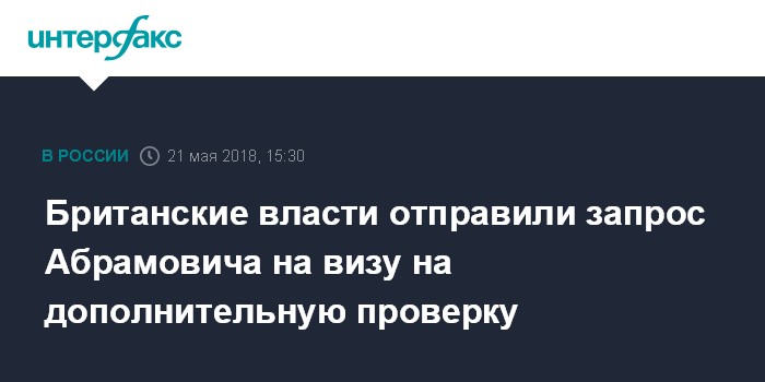 По их информации, в Лондоне подтверждают, что не отказали Абрамовичу в выдаче визы. Его запрос проходит дополнительную проверку, так как был подан из России, а не с британской территории.